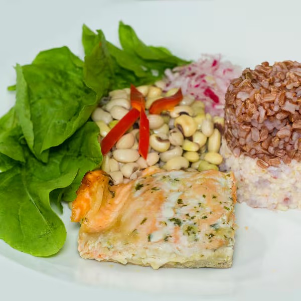 Feijão verde, arroz integral,farofa de soja, filé de salmão + salada orgânica.
