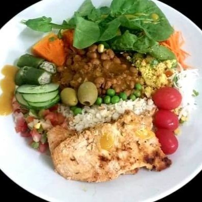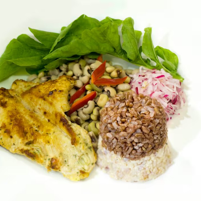Feijão verde, arroz integral,farofa de soja, filé de frango na chapa + salada orgânica.