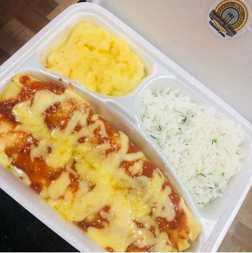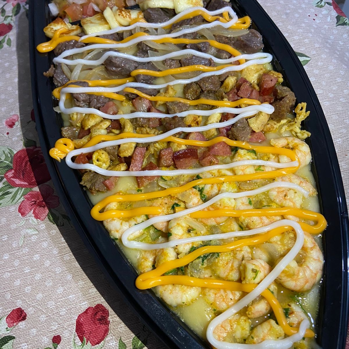 Delicioso pirao de aipim, com bastante recheio! 150gr de file de camarão, 150gr de carne do sol, 150gr misto( frango, carne,calabresa), cheddat e catupiry e salada vinagrete