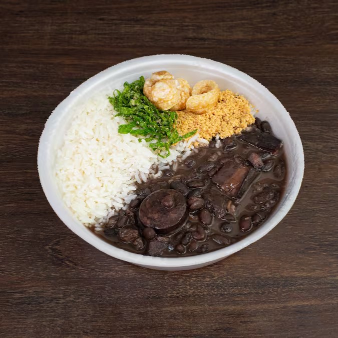 Feijoada, carne suína, linguiça calabresa, arroz fresquinho, farofa, couve. Aproximadamente 450g.