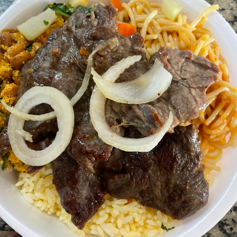 Bife acebolado, arroz, feijão tropeiro ou em caldo, macarrão e salada