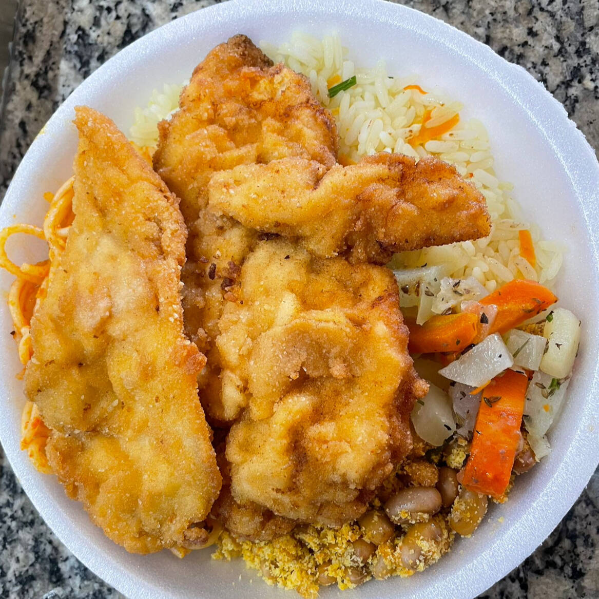 Delicioso frango a milanesa, acompanha: arroz, feijão tropeiro ou em caldo, macarrão e salada
