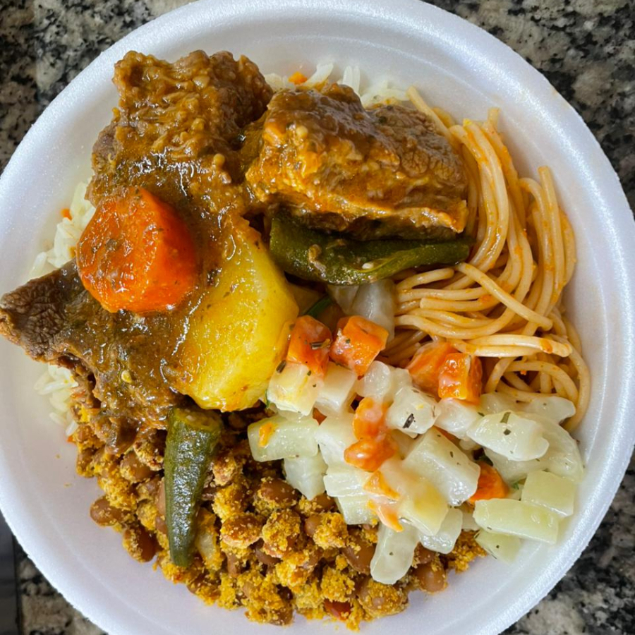 Arroz, feijão tropeiro ou em caldo, macarrão e salada