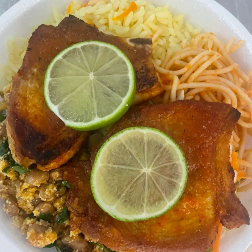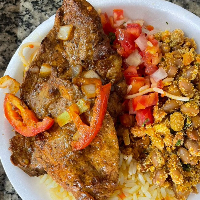 Suculenta bisteca suina, acompanha: Arroz, feijão Tropeiro ou em caldo, macarrão e salada