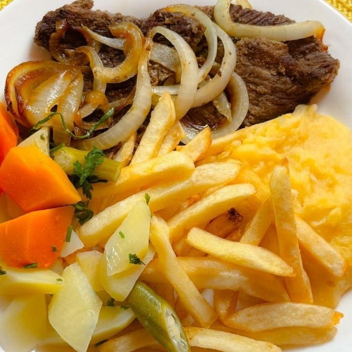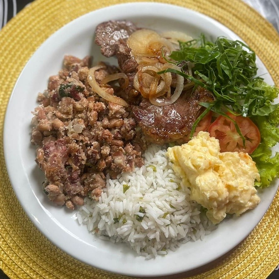 Acompanha: Feijão Tropeiro - Arroz - Salada Cozida. Aquele gostinho de almoço em família! Bife macio e suculento, selada na perfeição e finalizada com um molho encorpado de cebolas caramelizadas e especiarias da nossa cozinha. Simples, farto e irresistível. Perfeito para quem busca uma refeição completa e cheia de vida.