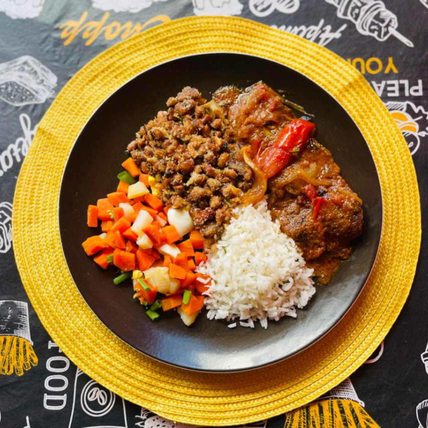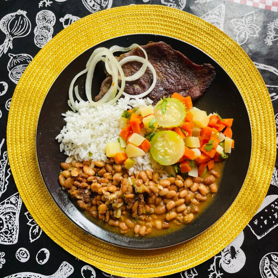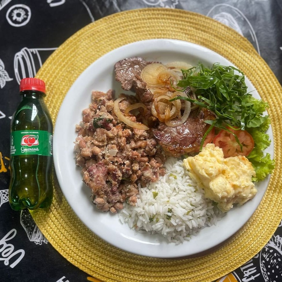 Bife Acebolado- Feijão Tropeiro - Arroz Branco - Salada De Folha Com Tomate -Pure De Aipim - Guaraná Antarctica 200 Ml