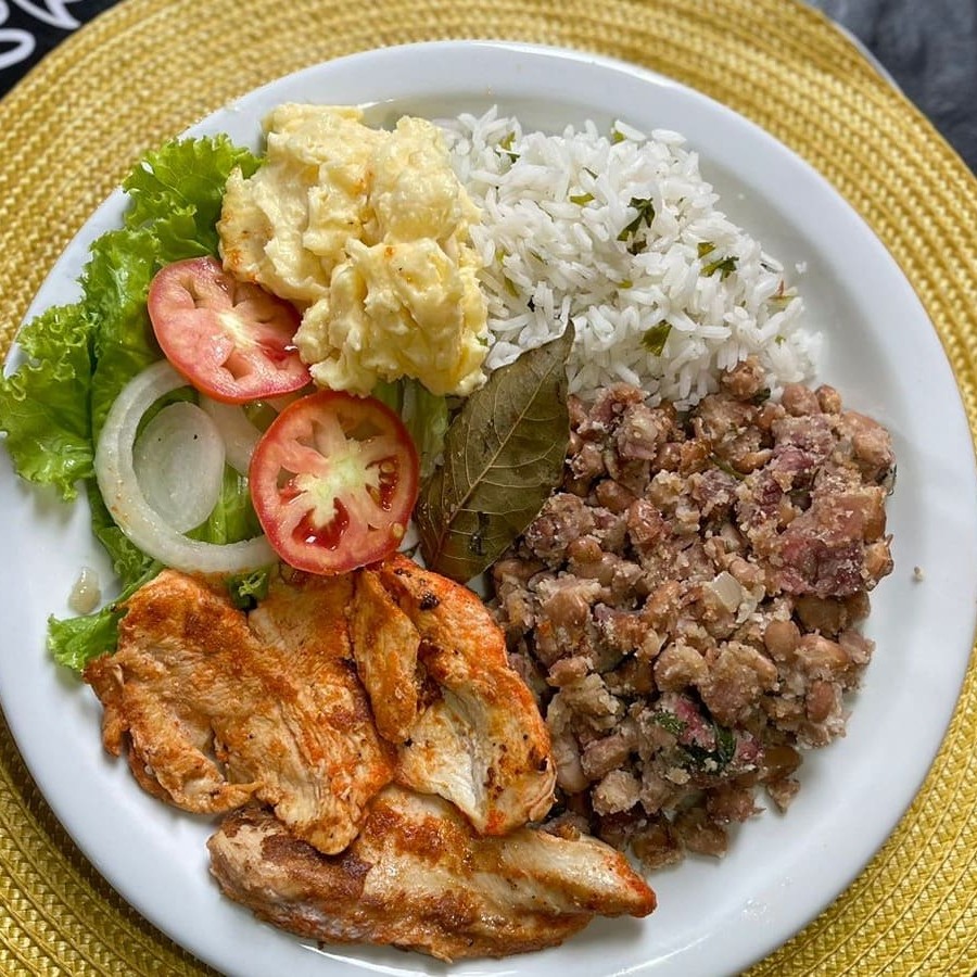 Acompanha: Arroz - Feijão de Caldo - Salada de folhas. Uma opção leve, saudável e cheia de sabor! Nosso filé de peito de frango é grelhado perfeitamente, mantendo a suculência e o tempero na medida certa (sal, alho e ervas finas). Ideal para quem busca uma refeição equilibrada sem abrir mão do prazer de comer bem.