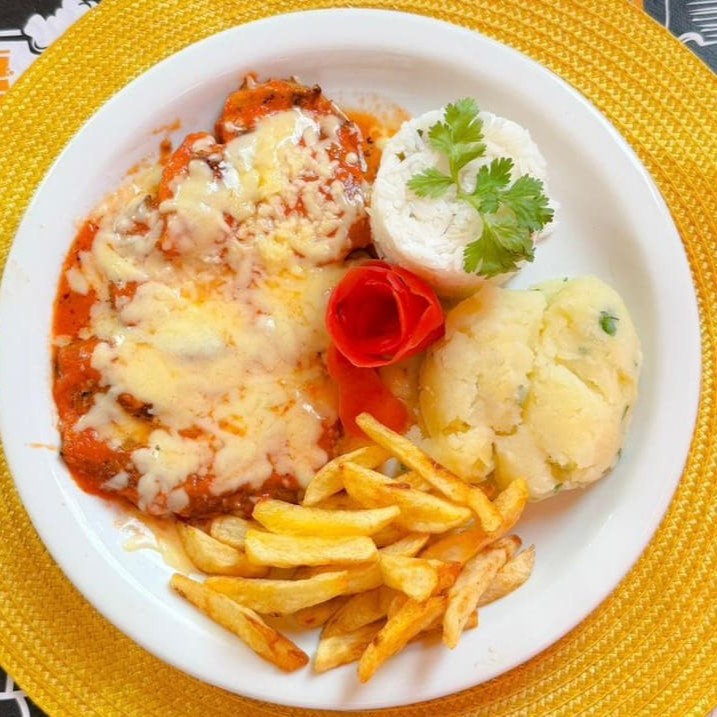 Parmegiana De Frango, Arroz Branco, Batata Frita aprox. 100g, Purê De Batata