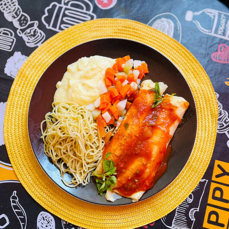 Acompanha: Macarrão - Purê de batata/aipim - Salada Cozida. Aquele abraço em forma de comida! Nossa panqueca é feita com uma massa leve e macia, recheada generosamente com frango desfiado e temperado com nosso refogado caseiro. Coberta com um delicioso molho de tomate e gratinada com queijo mussarela derretido. É o conforto e o sabor que você merece, com o carinho.