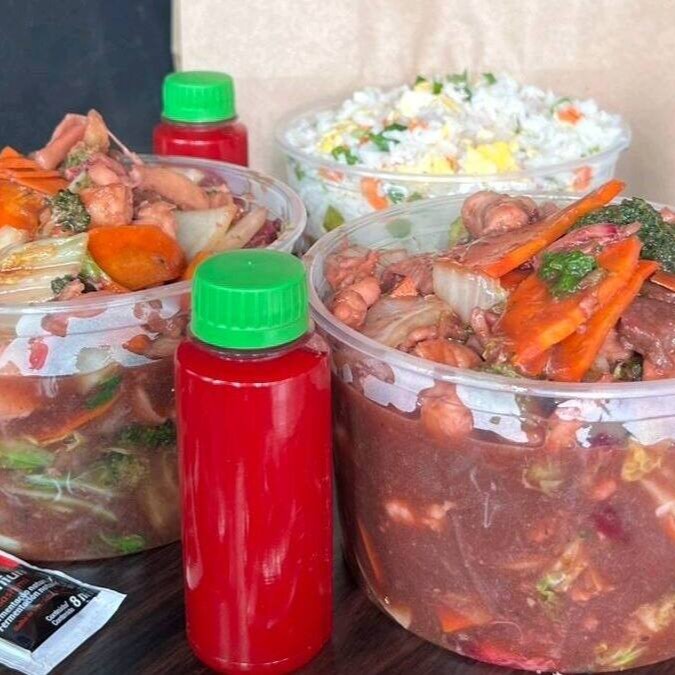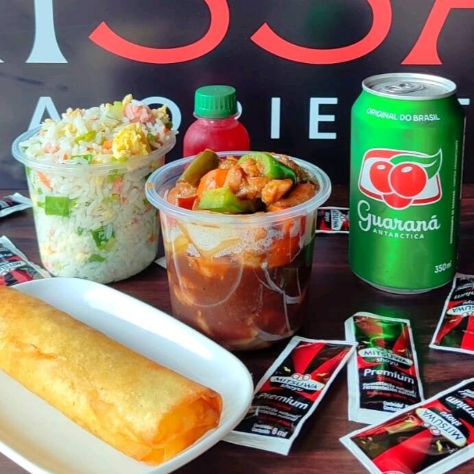 Frango Xadrez Com legumes apox. 350g, Arroz Shop Suey , Rolinho Queijo, Primavera ou Romeu e Julieta e 1 refrigerante em lata