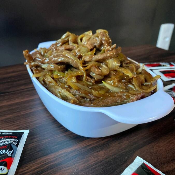 Carne Desfiada com Cebola apox. 350g, Arroz Shop Suey , Rolinho Queijo, Primavera ou Romeu e Julieta e 1 refrigerante em lata