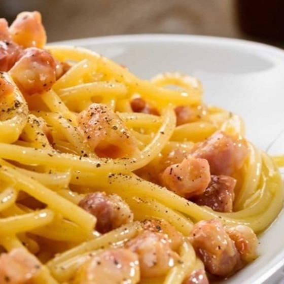 Massa Artesanal com Molho Pomodoro Artesanal feitos a partir dos melhores tomates italianos com manjericão e acrescido de calabresa em cubos picadas Sadia + Bacon Frito e Queijo Parmesão para finalizar!