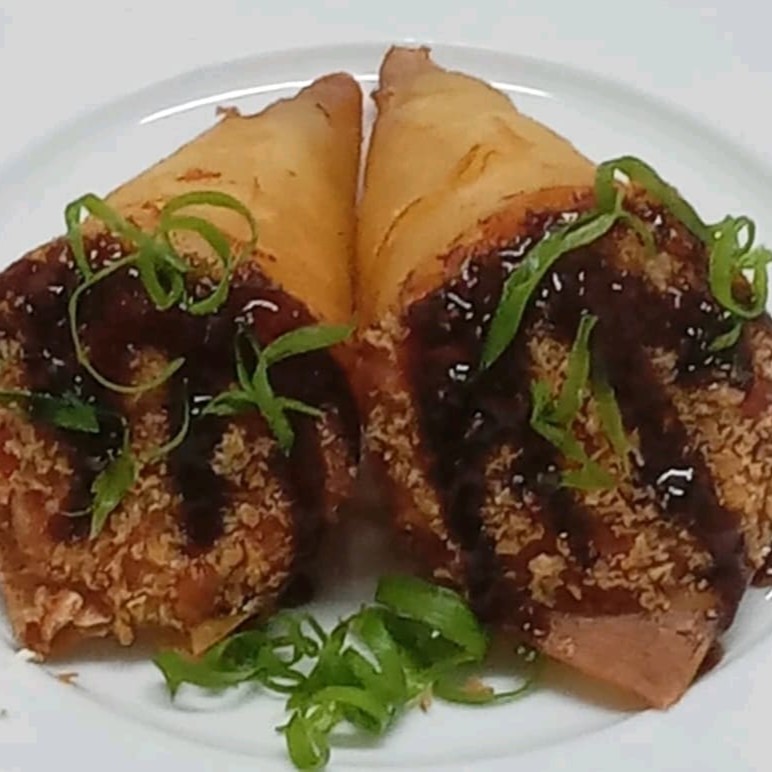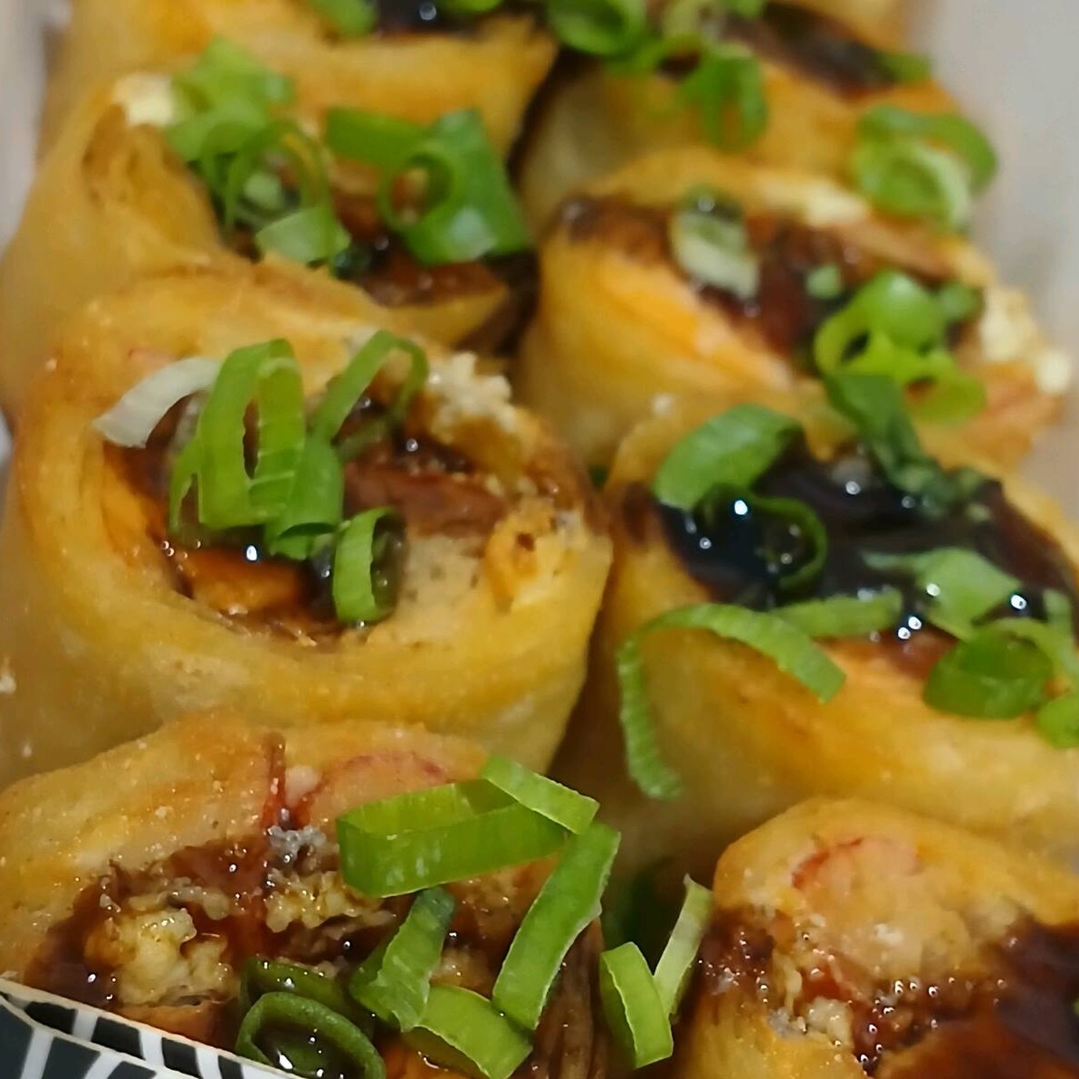 Desfrute de um deliciosos e elegante Hot Holl de Salmão Cream cheese Kane kama regado ao molho teriake e Cebolinha,10 - unidades, Ideal para compartilha, Aconpanha 02 -sache de molho teriake!