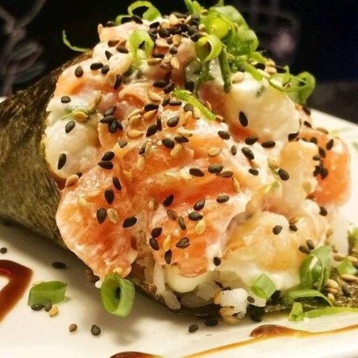 Desfrute de um deliciosos e elegante combinado 20 un + 01 Temaki,com Salmão grelhado Cream cheese coberto com Doritos,batata doce e Camarão regado ao molho teriake e Cebolinha,Ideal para compartilha,Aconpanha: 01 - Hashi, 01 - Nuzuki, 04 - sache de molho teriake!