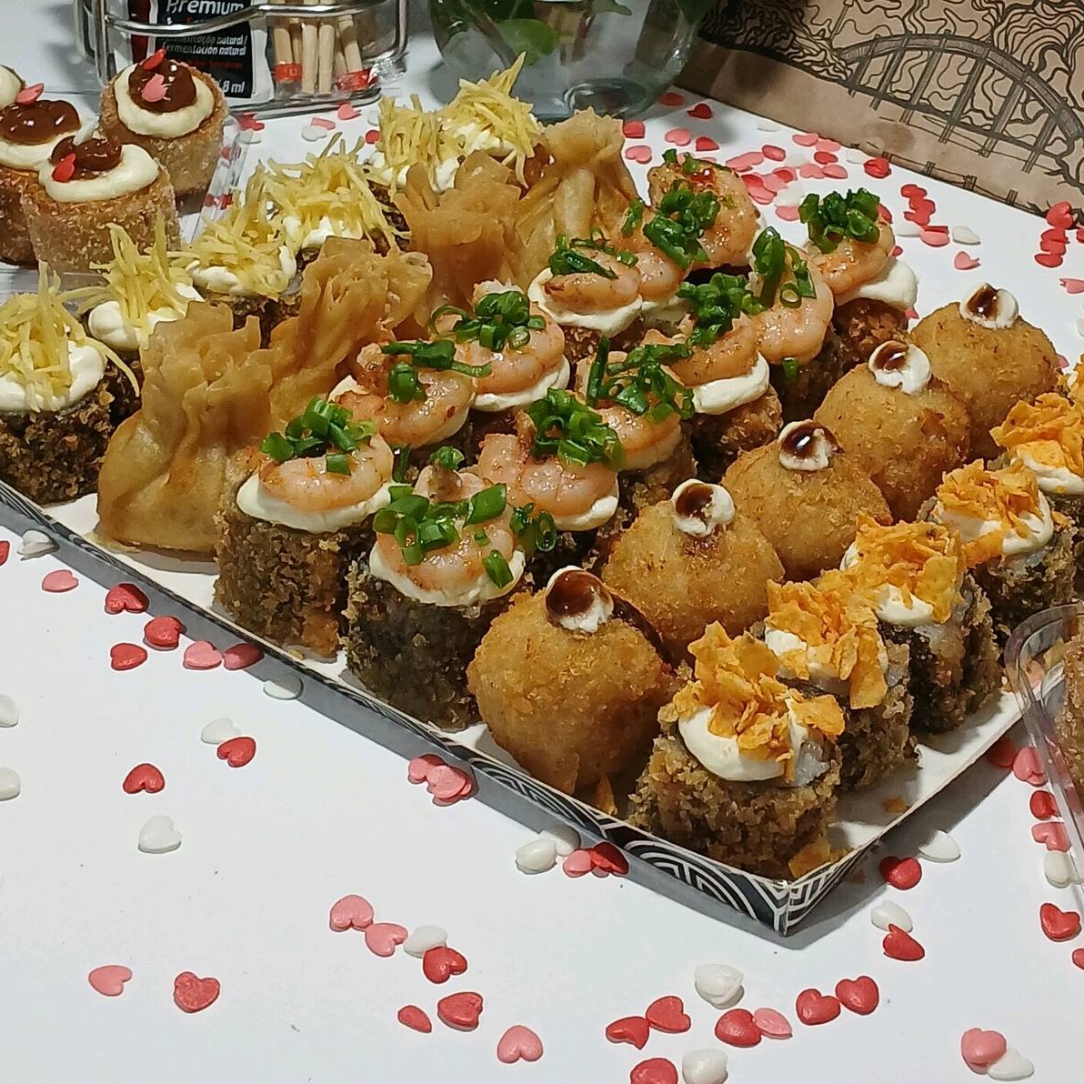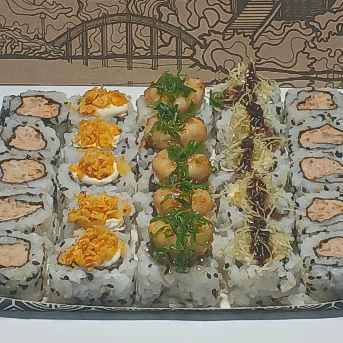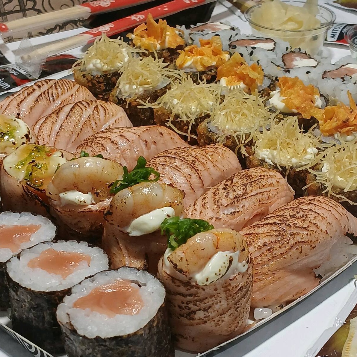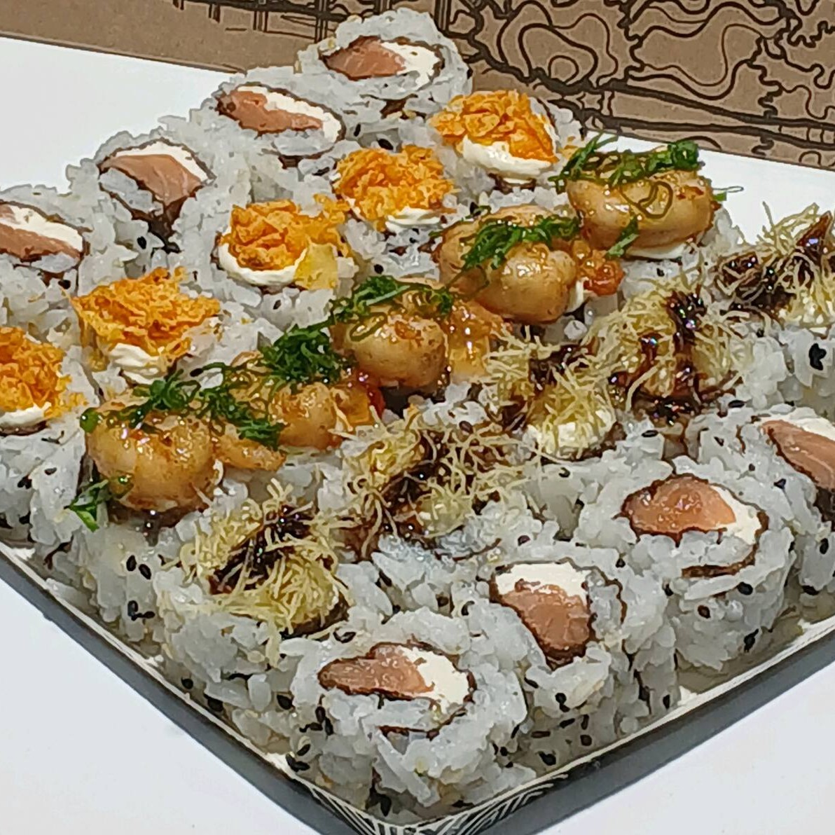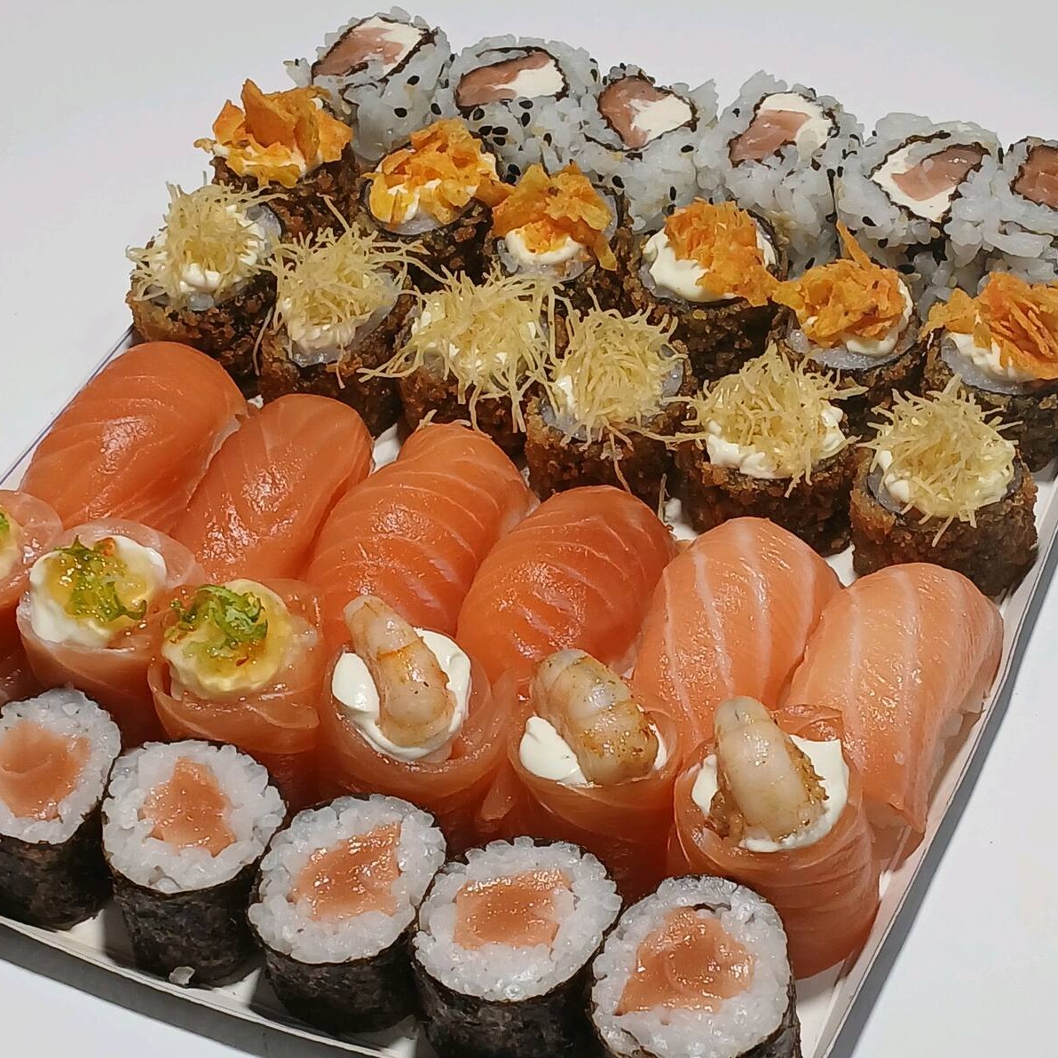 Desfrute de um deliciosos e elegante combinado 40 unidades de Salmão grelhado Cream cheese, 06 - Hot Philadelphia Cream cheese e Doritos, 05 - Troxinha de Salmão Cream Cheese casca de Harumaki, 12- Hot Philadelphia Cream cheese Camarão regado com geleia de pimenta e Cebolinha, 05 bolinhos de Salmão, 06 - Hot Philadelphia Cream batata doce regado ao molho teriake, 06 - sobremesas de Hot banana Cream Cheese e doce de leite, Ideal para compartilha, Aconpanha 02 - Hashi, 02 - Nuzuki, 06 - sache de molho teriake,