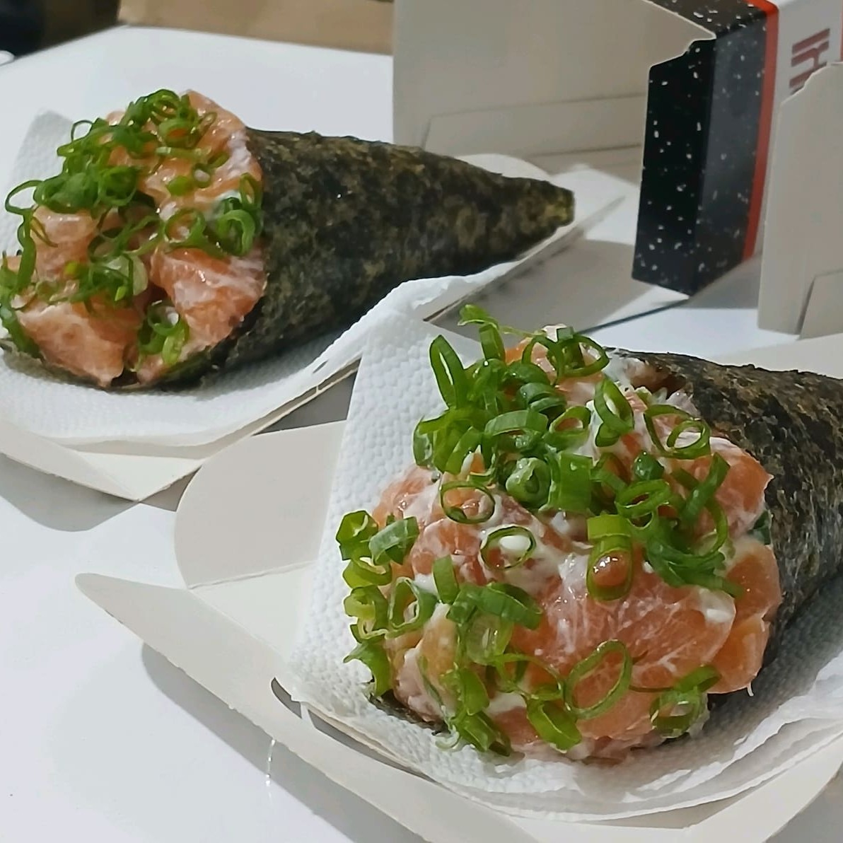 Desfrute de um deliciosos e elegante Hot Temaki Salmão grelhado Cream cheese regado ao molho teriake coberto com Cebolinha Ideal para compartilha, Aconpanha 02 - sache de molho shoyu!
