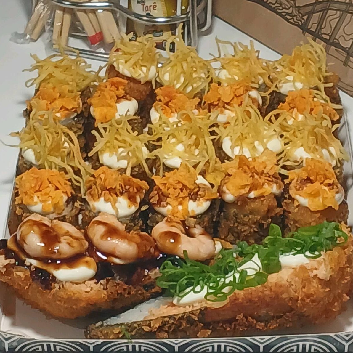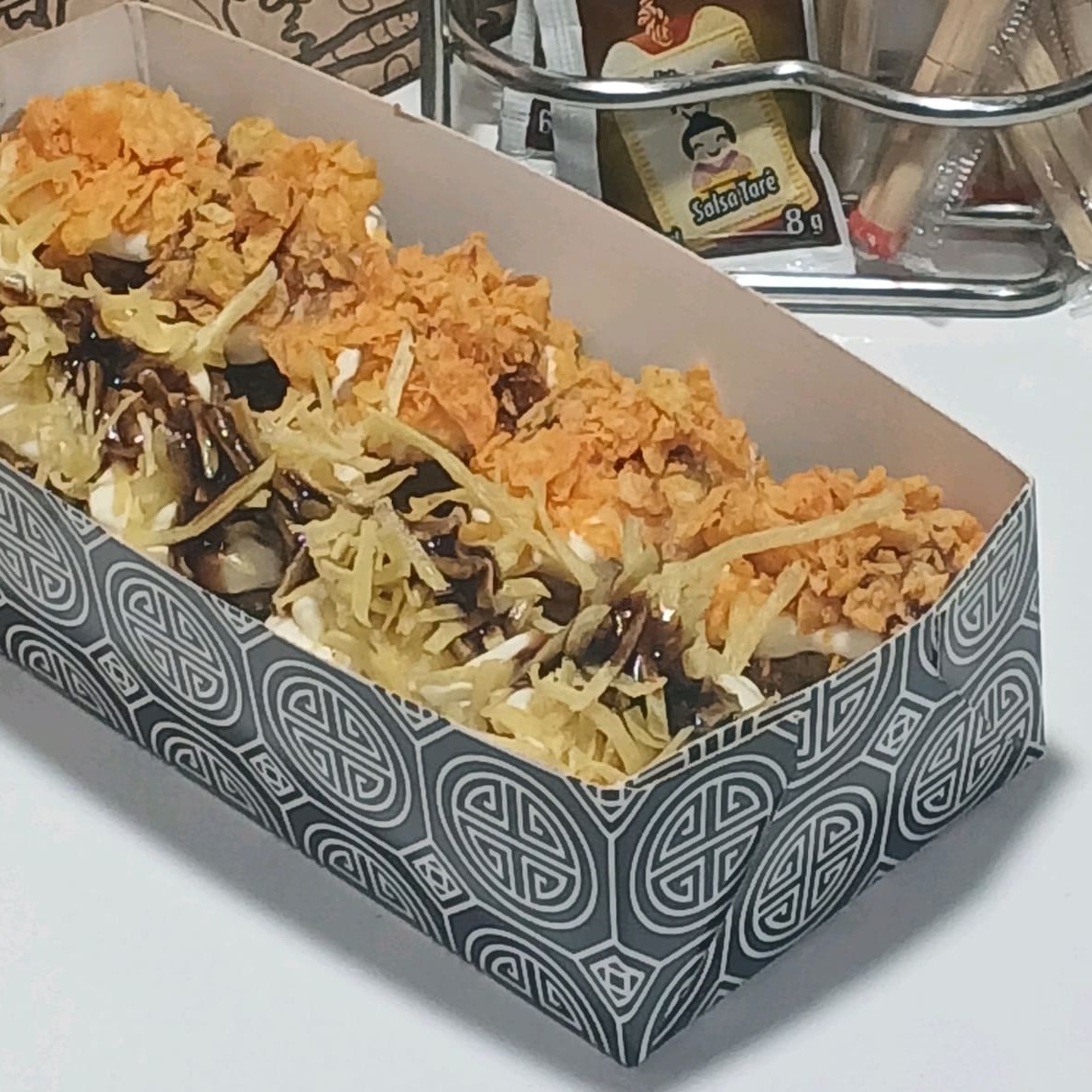 Desfrute de um deliciosos e elegante Hot Philadelphia Salmão Cream cheese coberto com Doritos batata doce regado ao molho teriake Ideal para compartilha,Aconpanha 02 - sache de molho teriake!