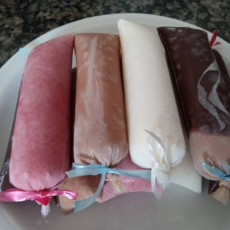 Temos sabores de frutas e bolachas.