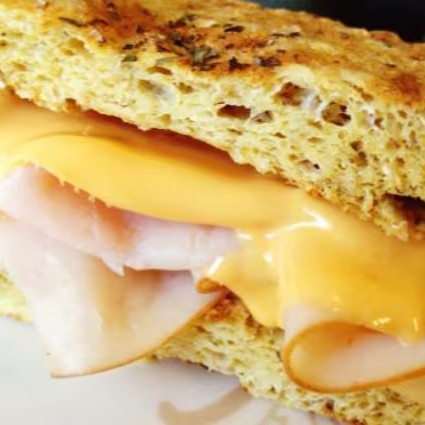 Pão com peito de peru defumado, carne, queijo derretido e salada fresca.
