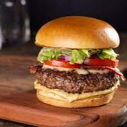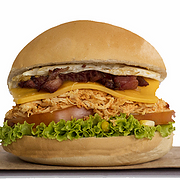 Pão com bacon crocante, carne, queijo derretido e salada fresca.