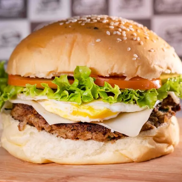 Pão com carne, queijo derretido, presunto, ovo frito e salada fresca.