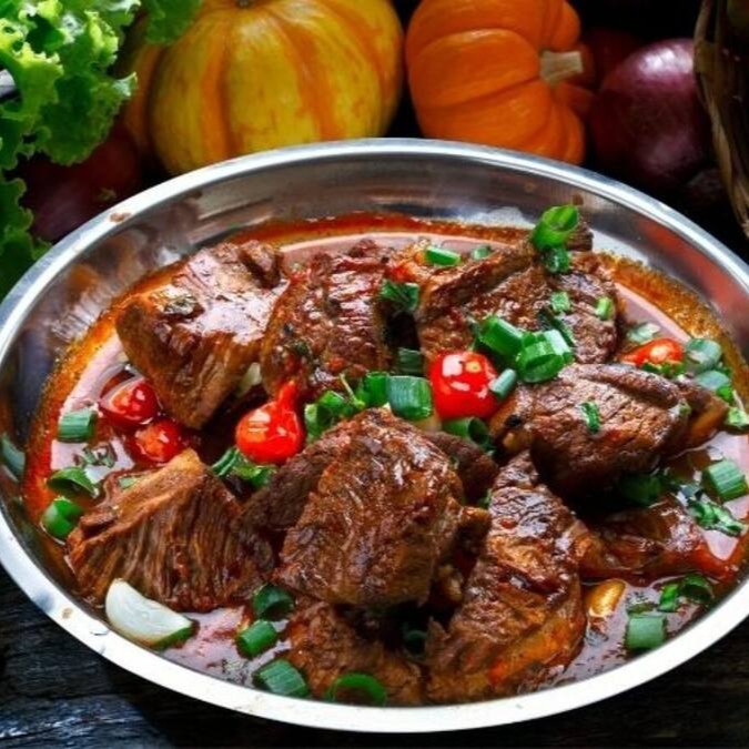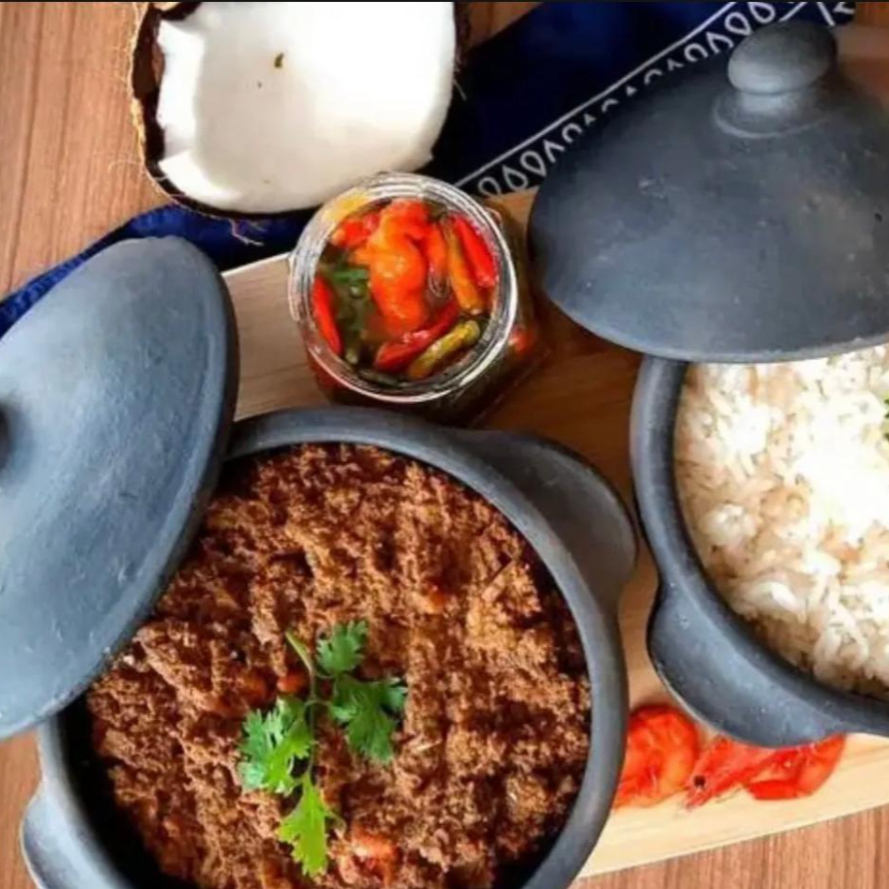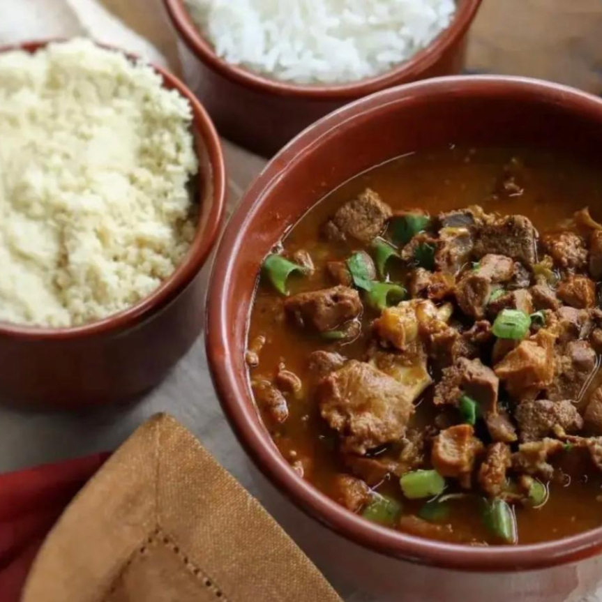 Nosso delicioso xinxim, um prato de carne de boi cozida com um molho cremoso de dendê,temperos e amendoim. Acompanhado por Arroz branco, farofa e vinagrete.