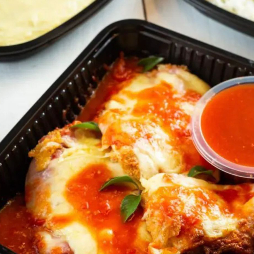 Desfrute do nosso delicioso Frango parmegiana, coberto com molho de tomate e queijo mussarela.