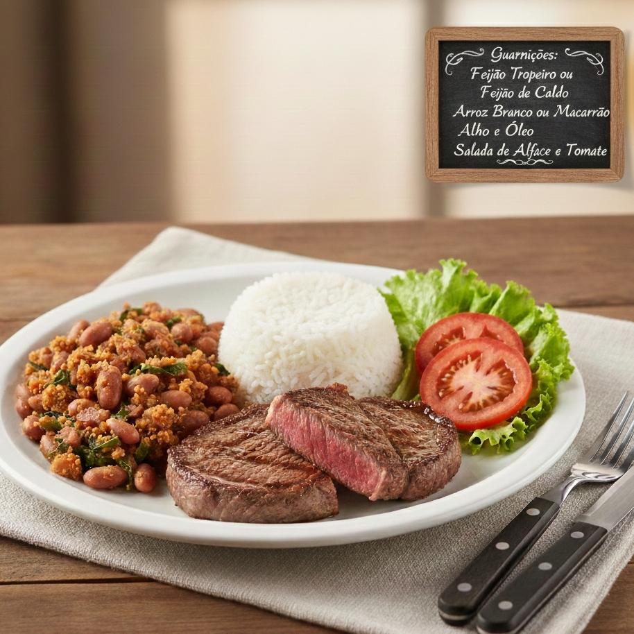 arroz ou macarrão, feijão tropeiro ou feijão de caldo ou purê e salada a parte. descrever as guarnições no pedido 2 opções