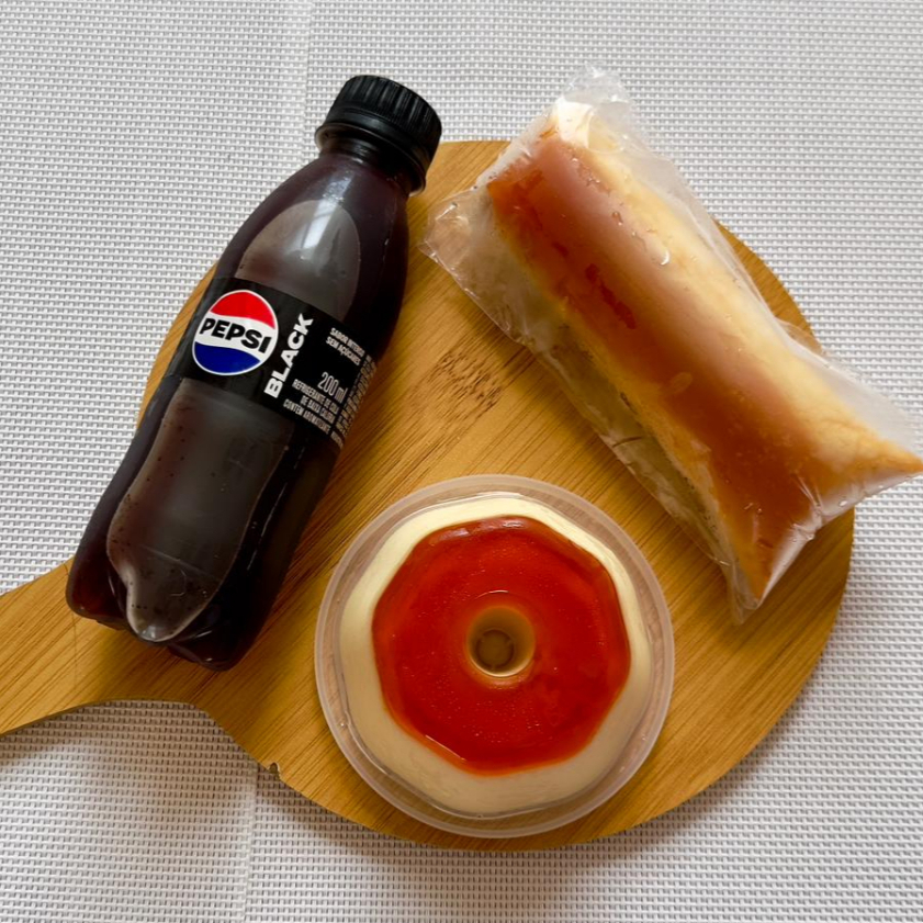 Geladinho de pudim + pudim tradicional 130g + refrigerante pet 200ml. Cremoso, refrescante e perfeito pra matar a vontade de doce!