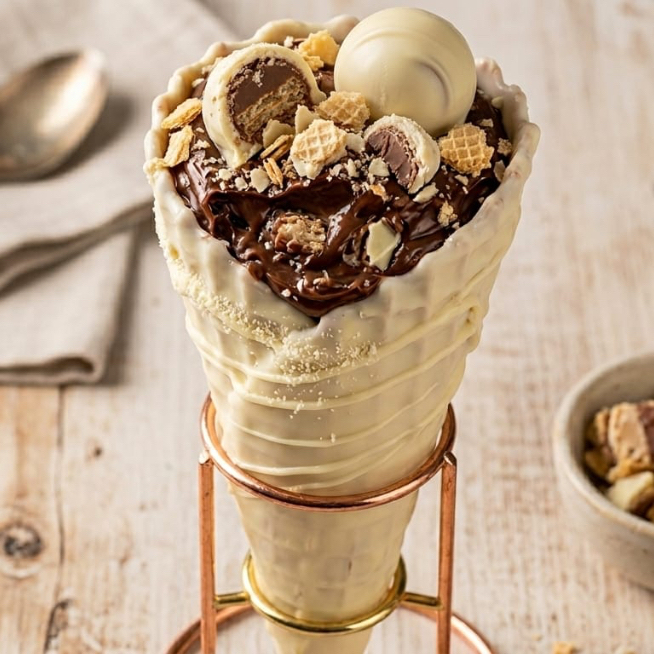 Delicioso cone, banhado no chocolate branco, recheado com brigadeiro e bombom Ouro Branco, decorado artesanalmente. Saboroso, elegante e irresistível, perfeito para quem ama um toque de magia!