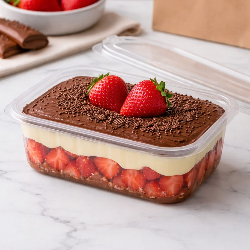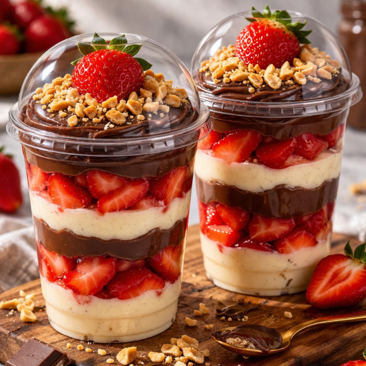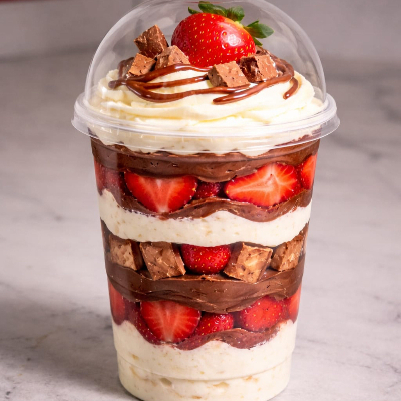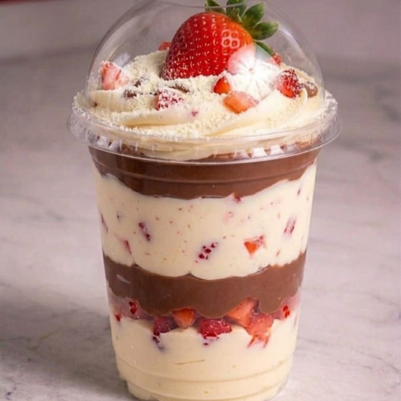Delicioso copo com camadas de nutella, recheio de chantininho, finalizado com morangos fresquinhos e leite em pó. Uma sobremesa cremosa e artesanal, perfeita para quem ama doces irresistíveis e cheios de sabor!
