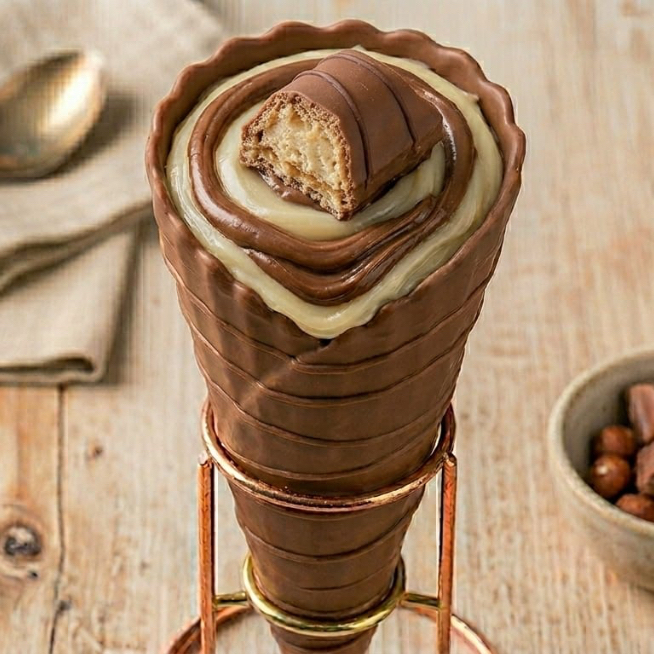 Cone cascão trufado, banhado no chocolate ao leite, com recheio de Ninho e nutella, decorado com Kinder bueno. Uma sobremesa divertida e irresistível, cheia de sabor e cor!