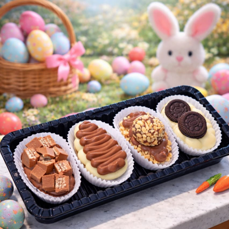 4 sabores de mini ovos para você se deliciar: nutella com bis / recheio de ninho com brigadeiro / recheio de nutella com amendoim triturado / recheio de ninho com oreo.