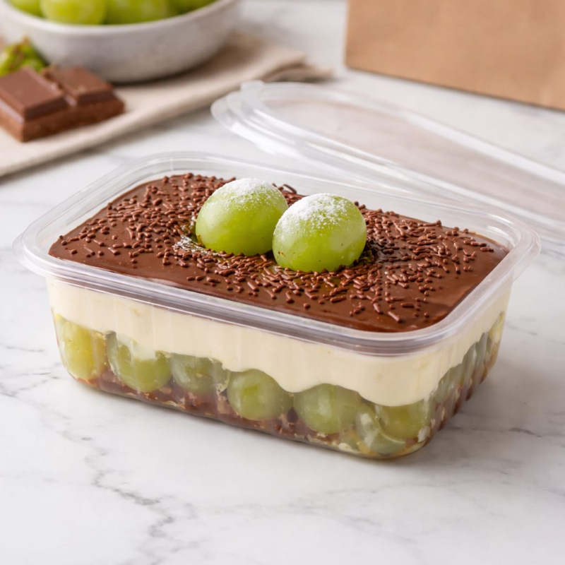 Uvas frescas com brigadeiro branco de chocolate branco, finalizado com chocolate meio amargo. Cremoso, equilibrado e irresistível.