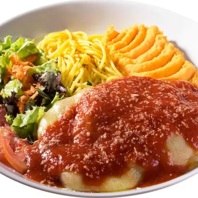Prato para 3 pessoas. Fatias de filé de frango temperadas com o exclusivo tempero Sal e Brasa, empanadas e fritas, servidas com queijo muçarela e molho pomodoro por cima. Acompanhado de 4 guarnições à sua escolha, totalizando 1,2 kg de acompanhamentos.
