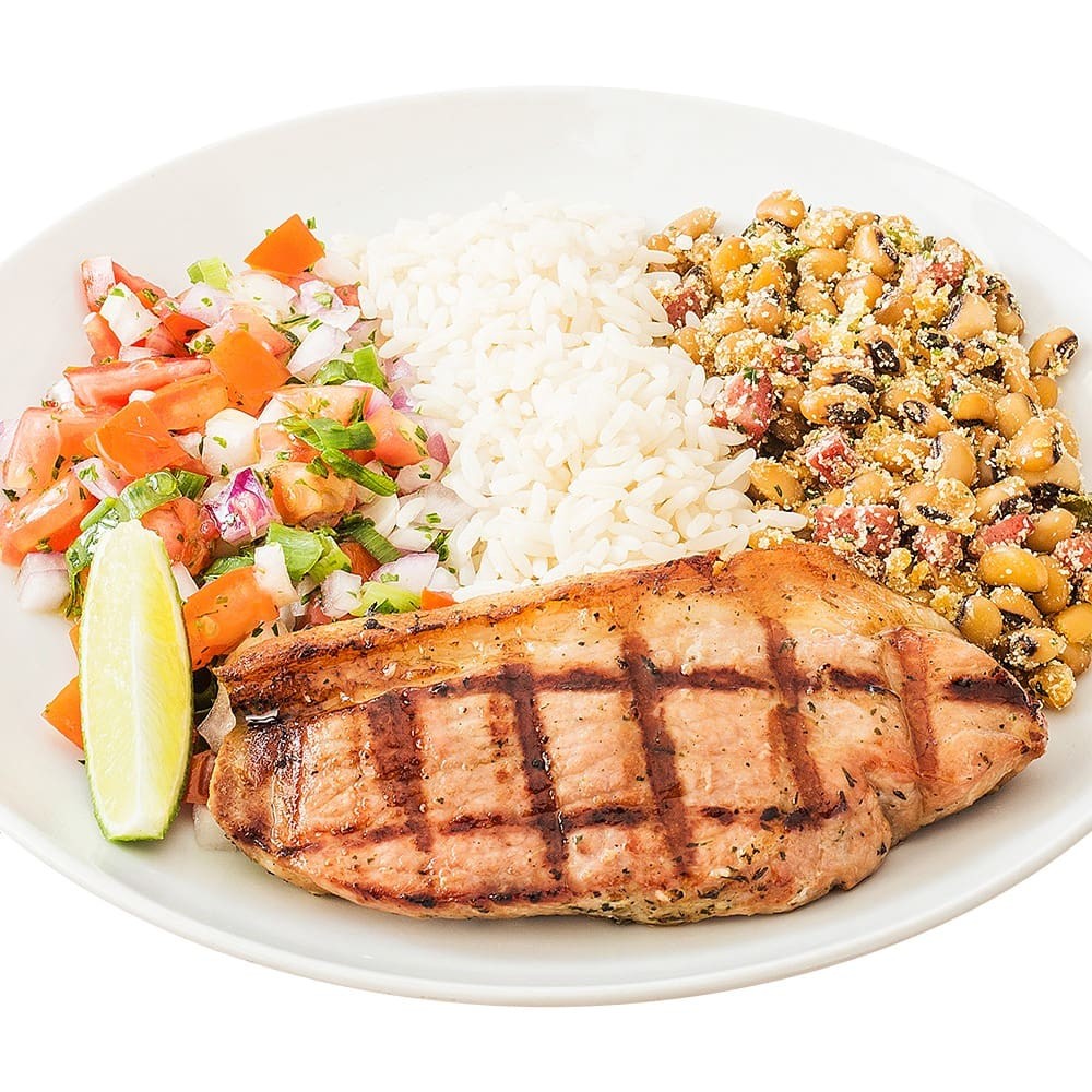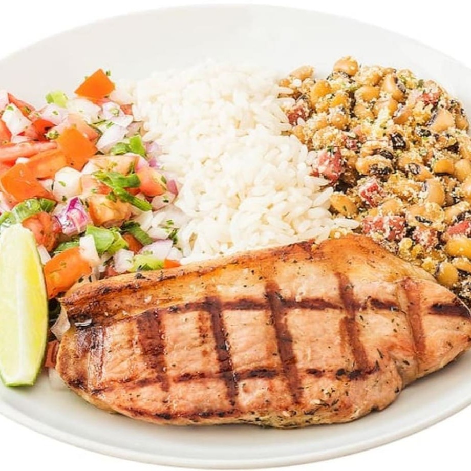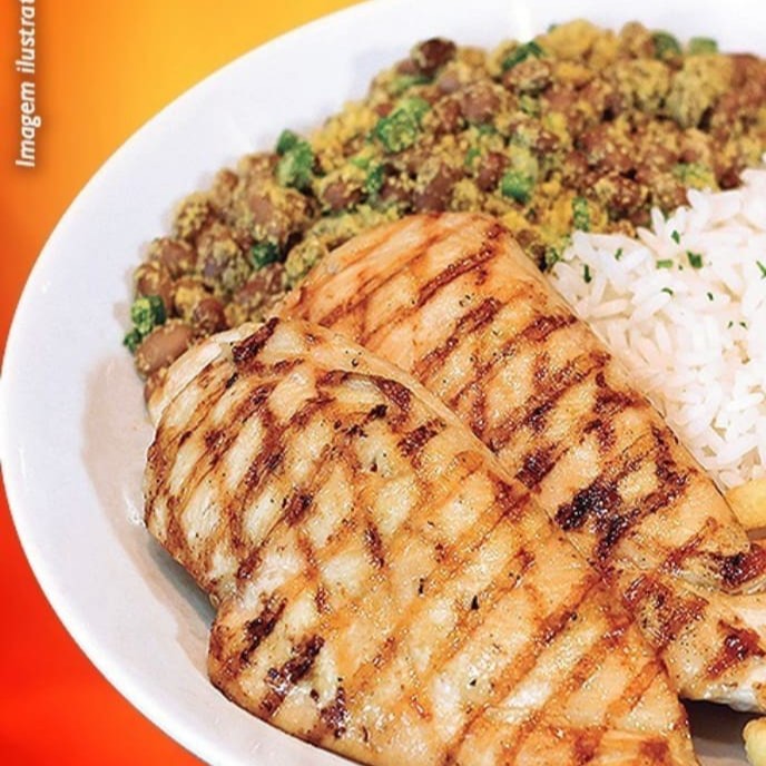 Corte do file do peito de frango preparado com tempero sal e brasa grelhado no char broiler. Refeição é servida com até 3 acompanhamentos a escolher.