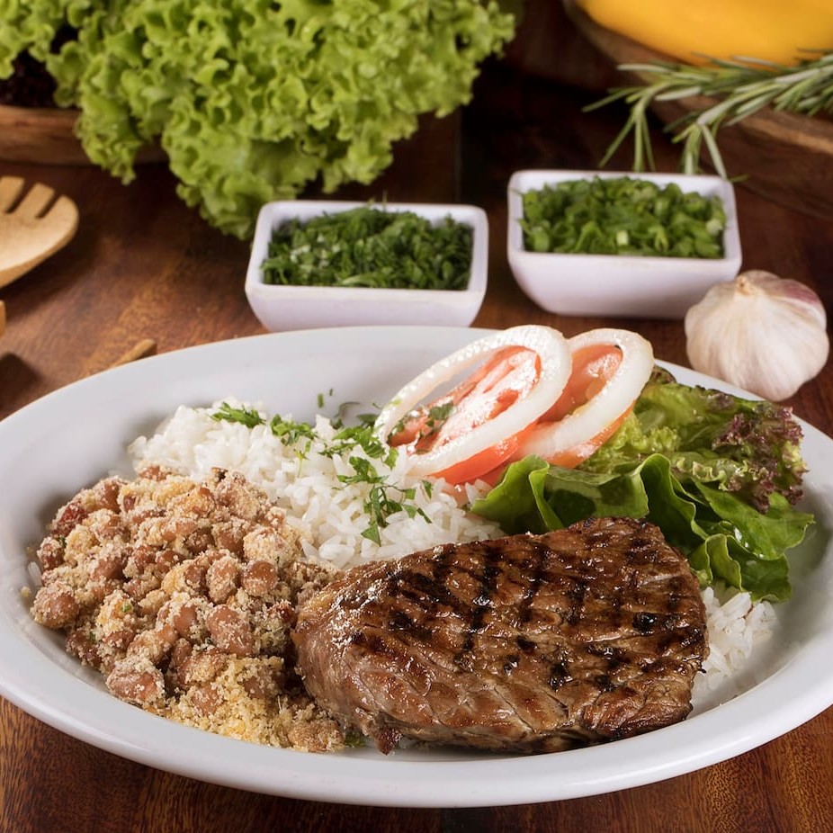 Corte retirado do coxão mole, marinado com ervas, cebola e vinho por 12 horas. Refeição acompanha até 3 acompanhamentos a sua escolha