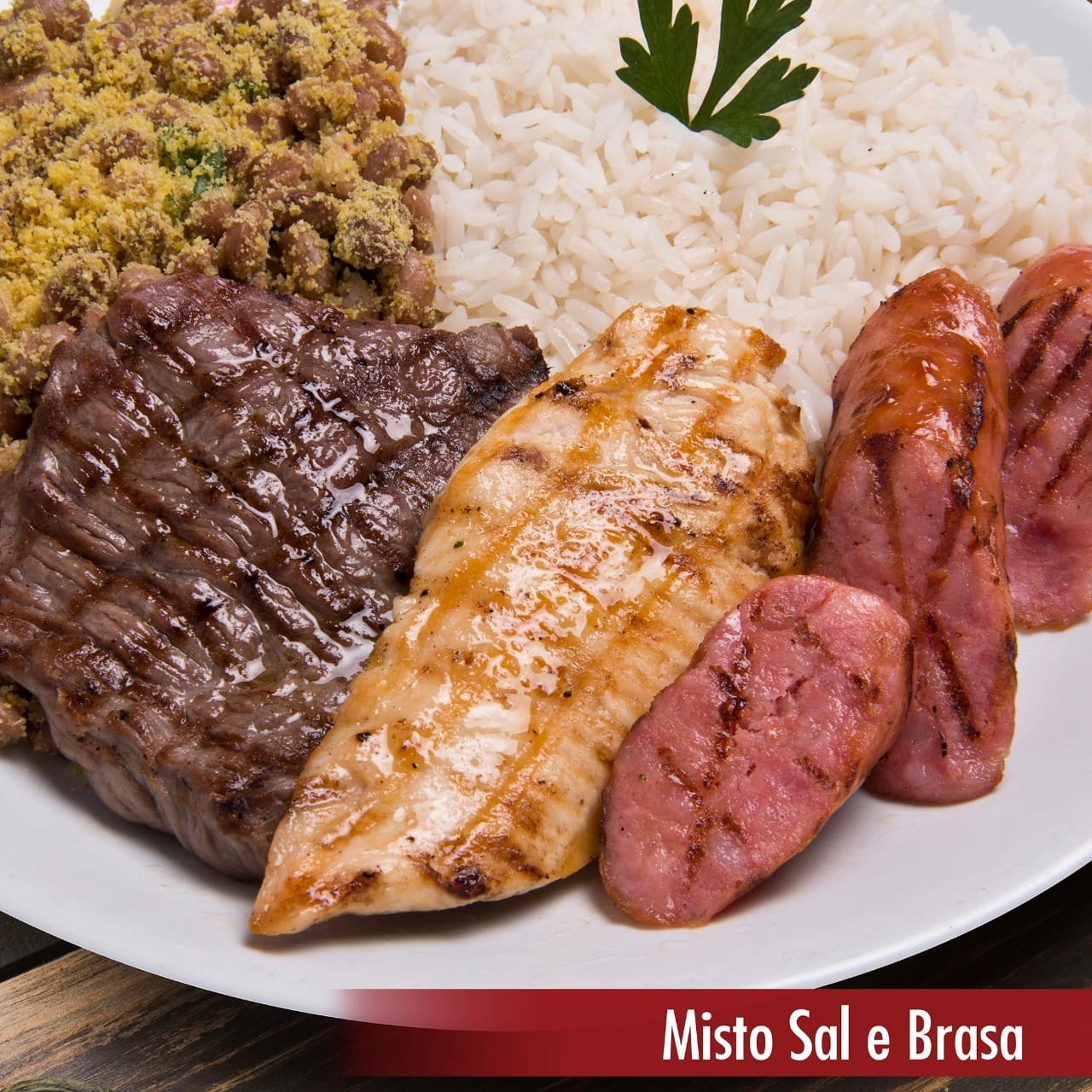 Combinação de três proteínas (carne, frango e toscana) com tempero sal e brasa grelhados no char broiler. Refeição é servida com até 3 acompanhamentos de sua escolha.