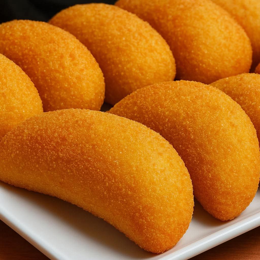 Bolinho de bacalhau recheado com queijo derretido, uma explosão de sabor a cada mordida.