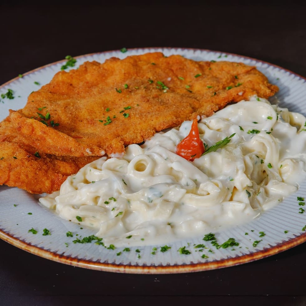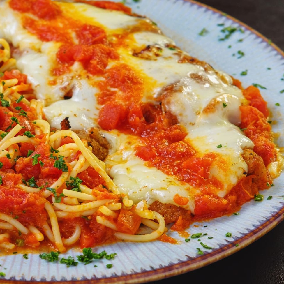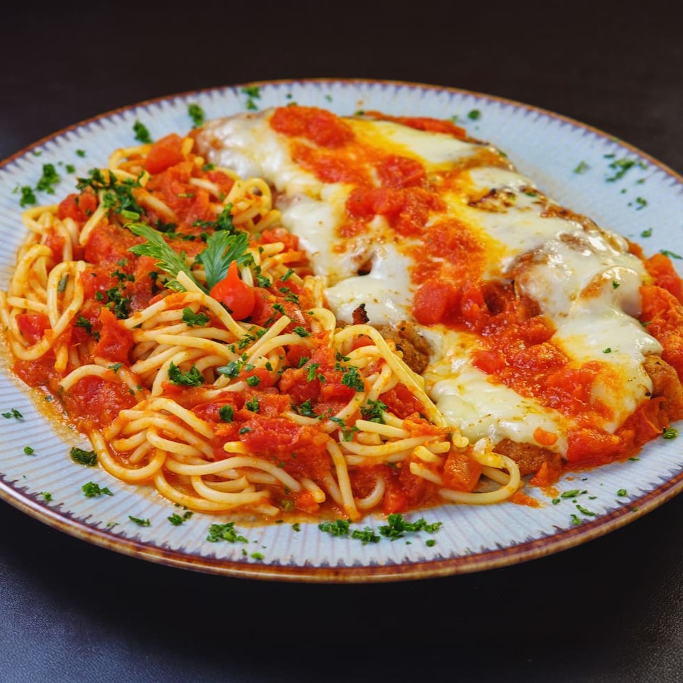 Nossa deliciosa parmegiana feita de frango empanado coberto de queijo muçarela maçaricado e presunto acompanhada de spaghetti ao molho de sua preferência.