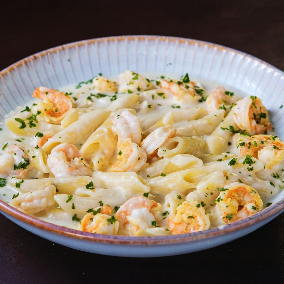 Penne ao molho branco Salvatore acompanhado de camarões. Ganhe um refrigerante de lata (350ml) para acompanhar