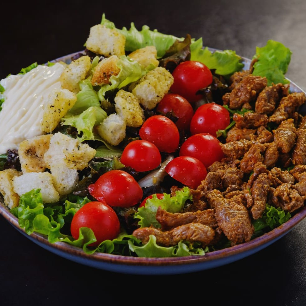 Mix de alfaces (americano, roxo e crespa), tomate cereja, croutons regadas ao molho caesar com tiras de filé mignon.