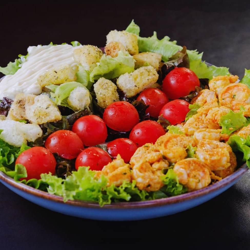 Mix de alfaces (americano, roxo e crespa), tomate cereja, croutons regadas ao molho caesar com camarões.