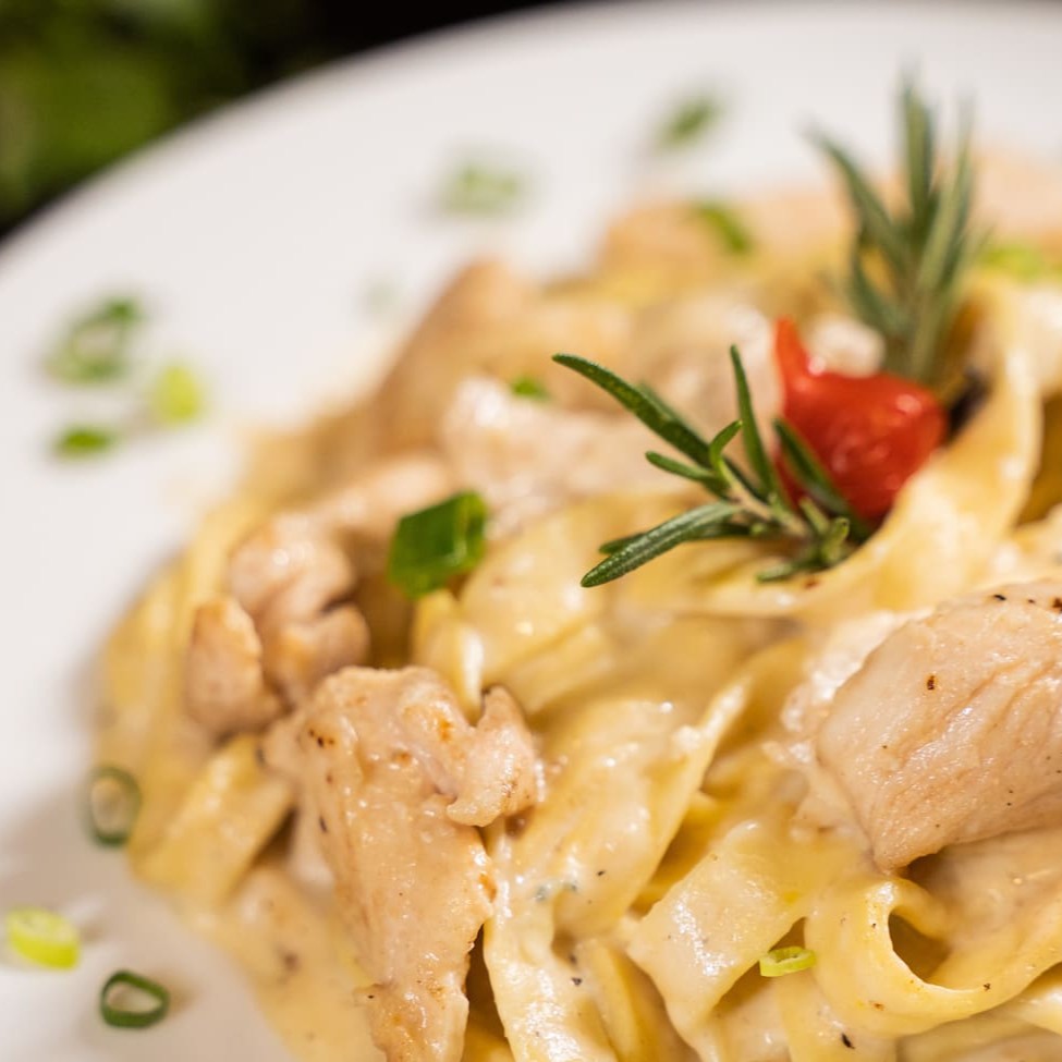 Nosso delicioso Fettucine ao molho branco Salvatore com tiras de frango.