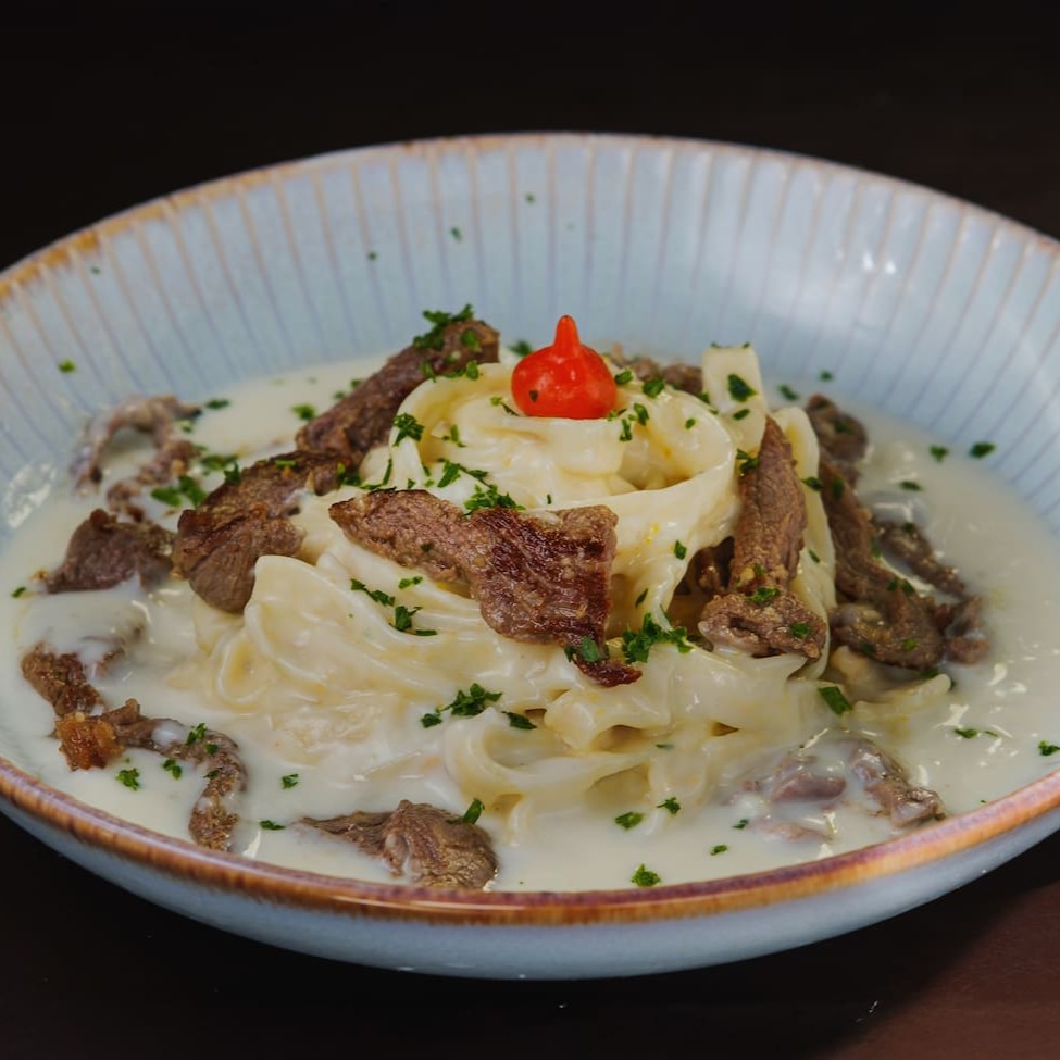 Fetuccine envolvido em molho branco com tiras de filé mignon acompanhado de 1 refrigerante de litro.