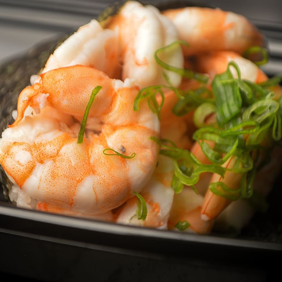 Arroz de sushi envolvendo camarão, cebolinha e gergelim.