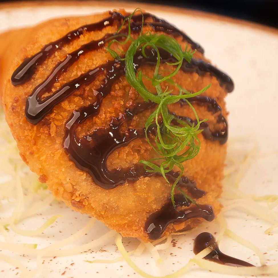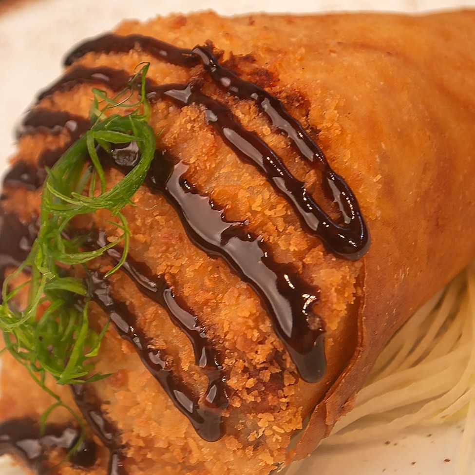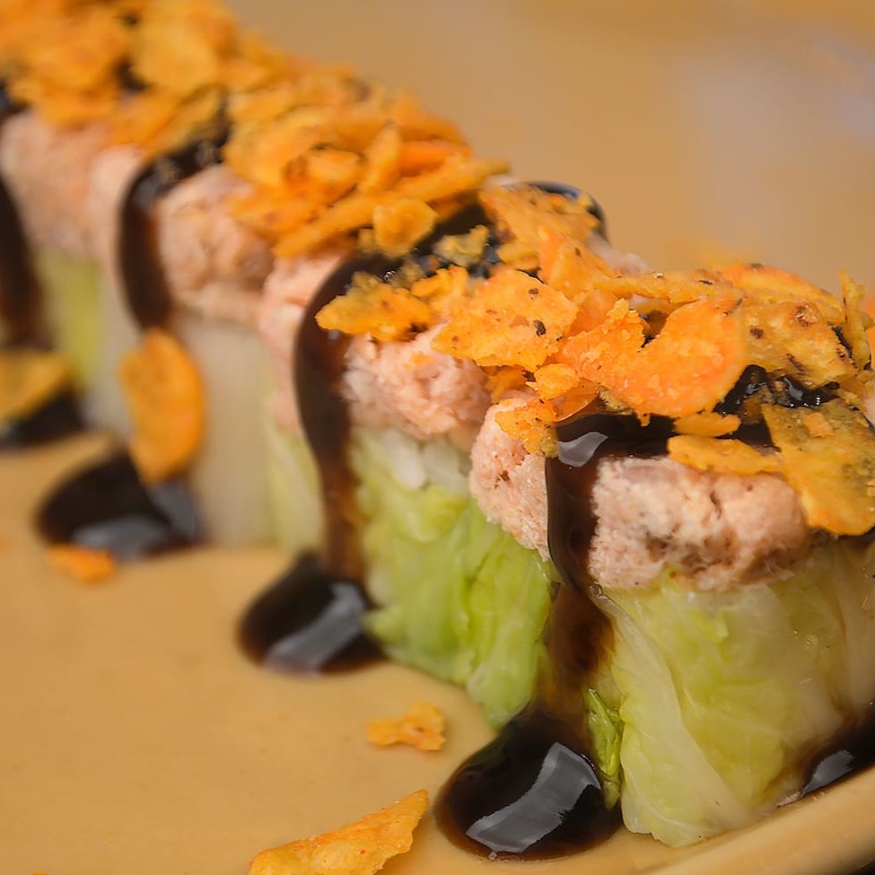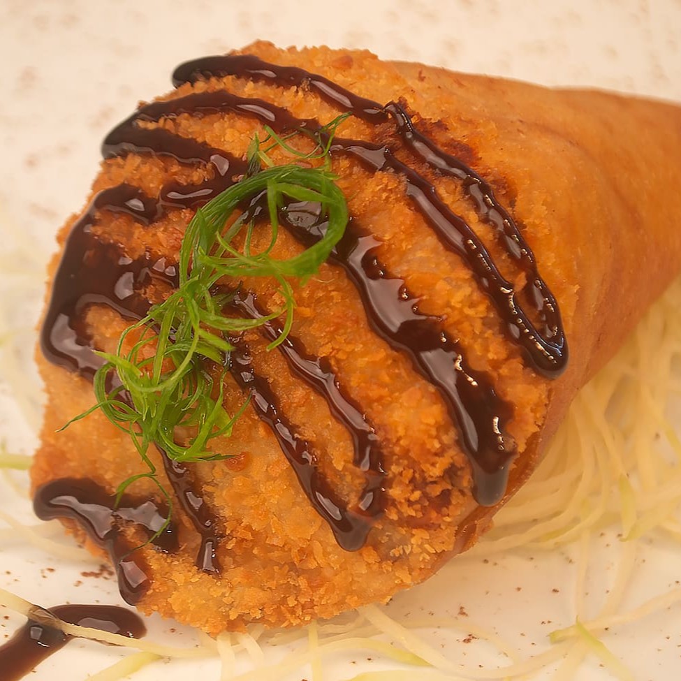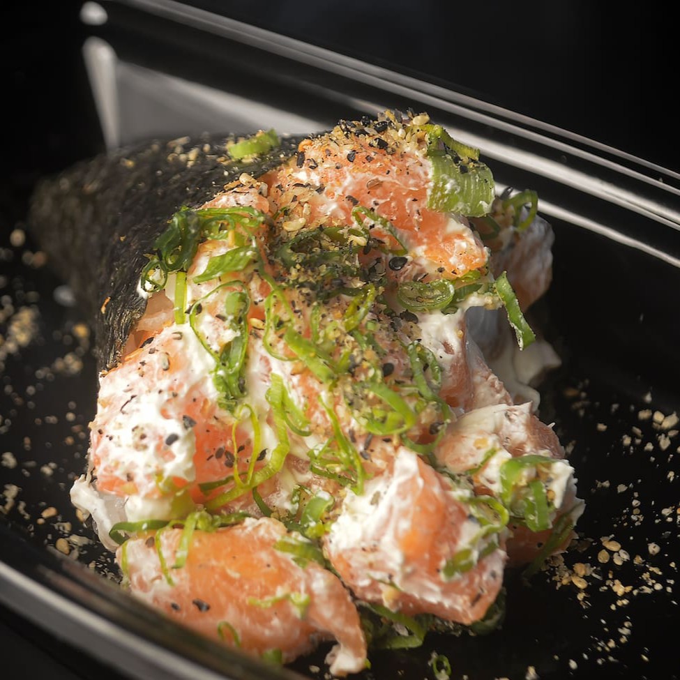 Salmão folheado à massa de harumaki frito, kani, cream cheese e cebolinha.