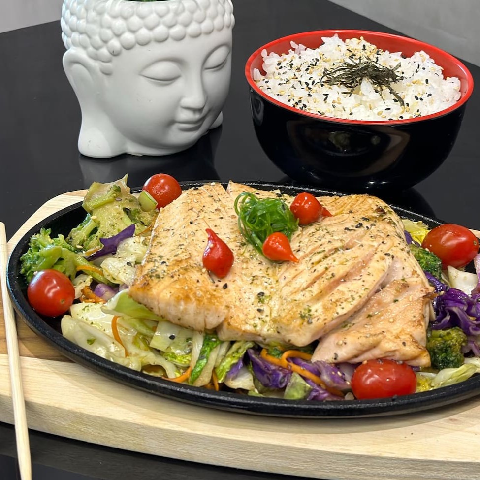 Um suculento filé de salmão grelhado na chapa, servido com um mix de legumes frescos e nosso arroz especial de brócolis ao alho. Um clássico da casa!