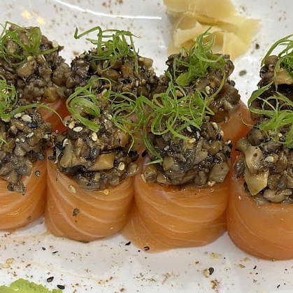 Lâminas de salmão envolvendo arroz, recheio de shimeji, levemente picante, cebolinha.