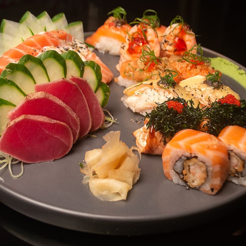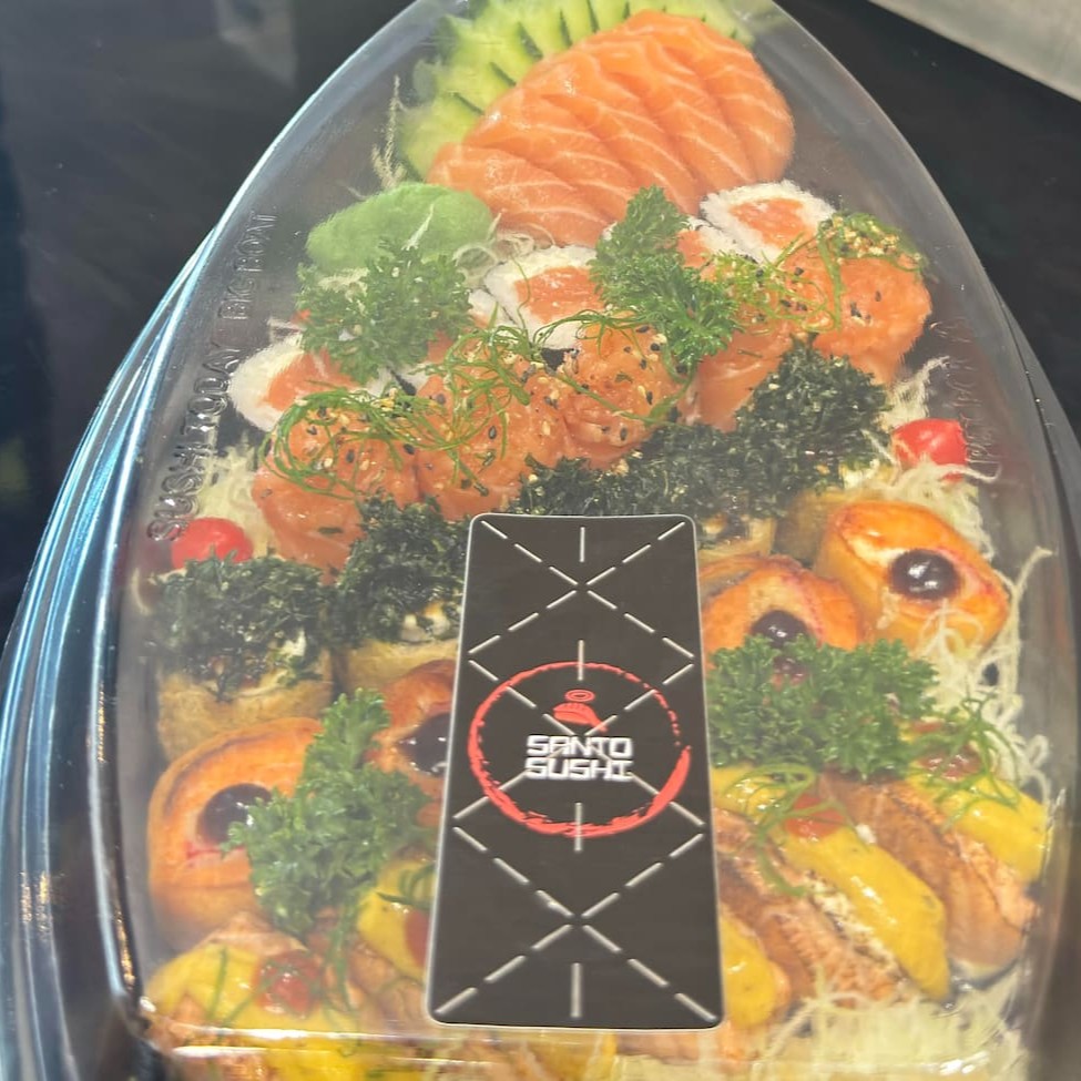 Perfeita para dividir! Uma seleção de 30 peças com 5 Sashimis de Salmão, 5 Hossomakis, 5 Dyo de Salmão, 5 Shake Couve, 5 Hot Rolls crocantes e 5 Sanduíches de sushi especiais com molho de maracujá.